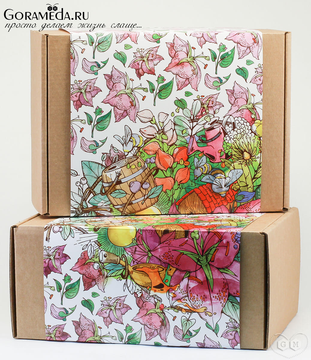 Красивая коробка в эко стиле для подарка женщине на 8 марта, обернутая ярким шубером (обечайкой), что сделает ваш подарок действительно оригинальным. Шубер разрабатывался специально для магазина «Гора Мёда».