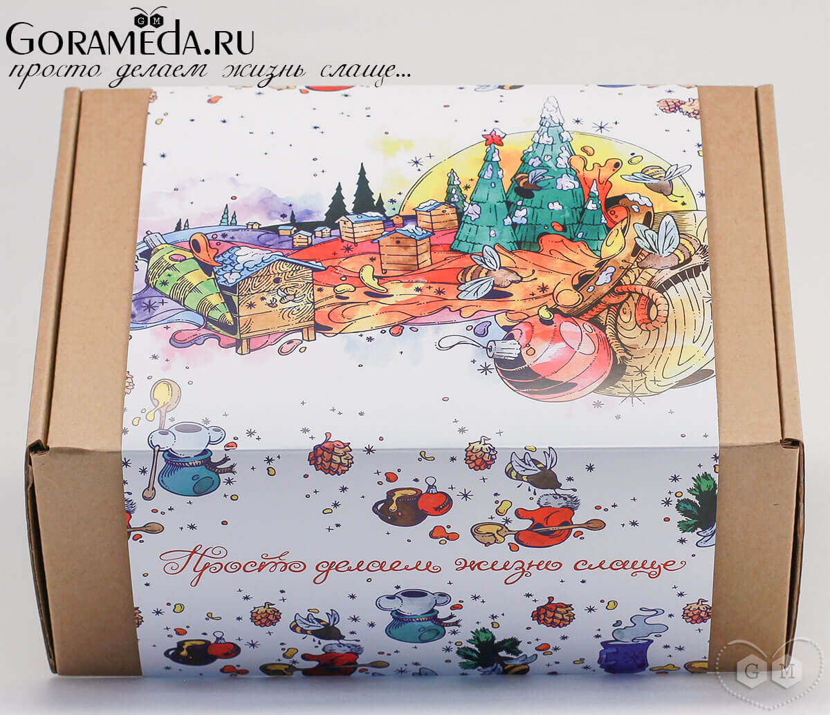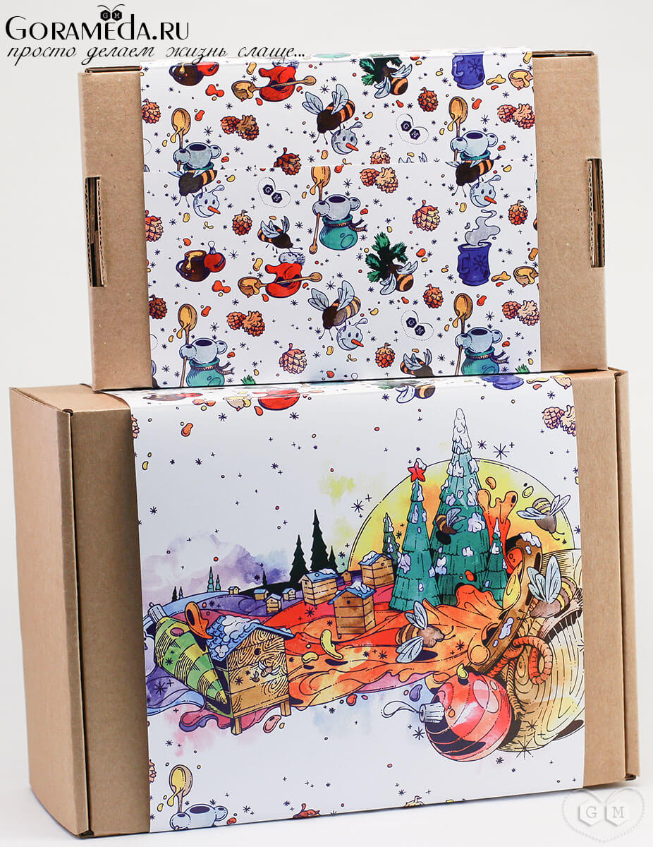 Красивая новогодняя коробка обернутая оригинальной обечайкой (шубером) - удобная упаковка для ваших подарков на Новый год. На шубере оригинальный тематический паттерн и яркая иллюстрация, которые не только интересно рассматривать, этот декор сразу создаст праздничную атмосферу.